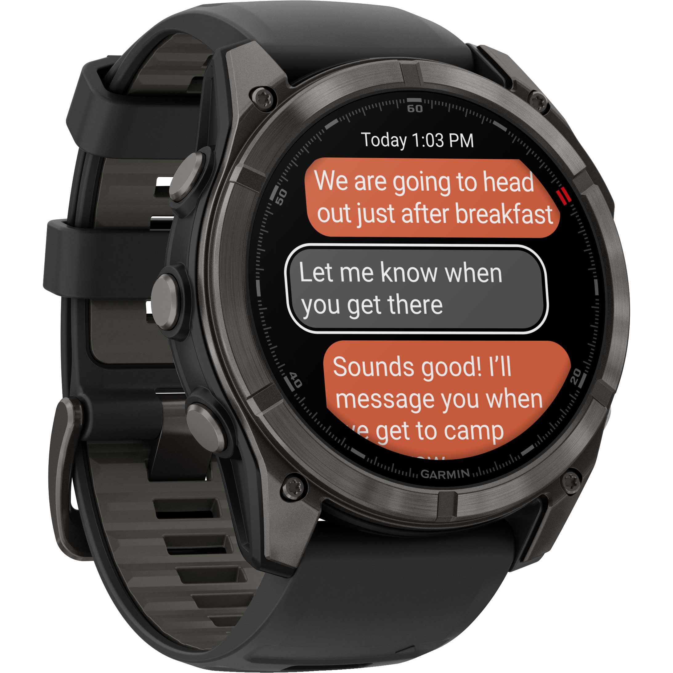 - Sending messages on the move: You can share messages with other users of the Garmin Messenger app directly via the smartwatch using a satellite or LTE connection. The app automatically synchronizes your contacts when the smartwatch is paired with your smartphone.