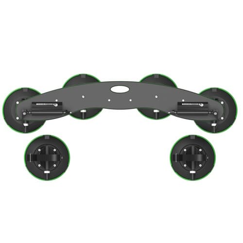 Le plateau en polycarbonate double couche du Pro 2 est équipé de 4 ventouses TreeFrog, d’une capacité de 110 kg chacune, de 2 supports de fourche universels de 20×110 mm et de 2 porte-roues arrière robustes en forme d’échelle.