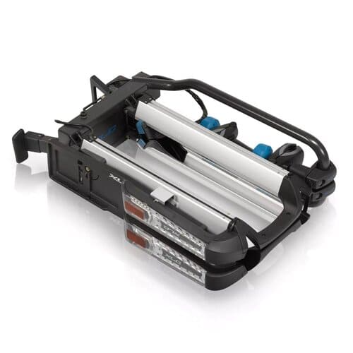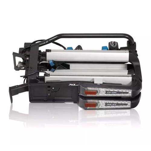 Il est conçu pour 2 vélos, mais peut être étendu à un 3e vélo grâce à un adaptateur (kit d’extension XLC 3e roue VC-X26). Pour le rangement, le porte-bagages arrière se plie à une taille de 245 x 780 x 500 mm.